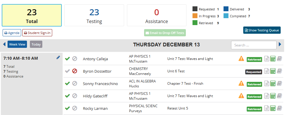 Teachers can request times for students to utilize the academic resource center for test taking or academic assistance. The system is configured with the maximum number of students that can utilize the ARC during given time blocks. Test taking is tracked, and teachers are notified of progress.